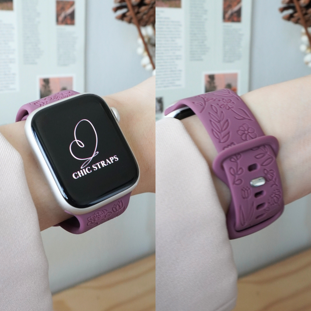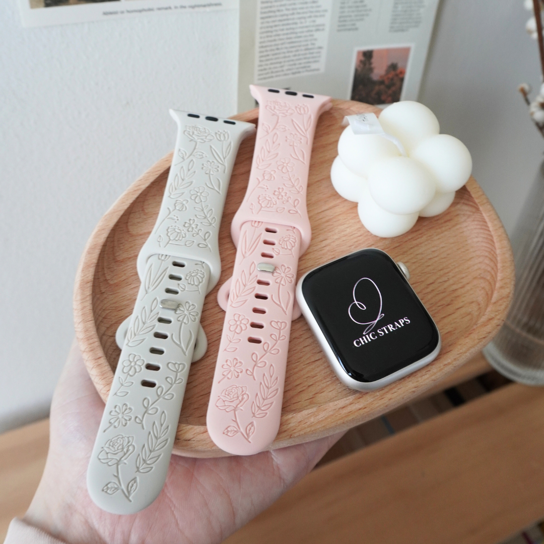 Presenting our soft silicone Flora Straps adorned with delicate floral engravings, blending elegance with comfort seamlessly. Crafted from high-quality silicone, this band offers a luxurious feel against your skin while providing durability for everyday wear.