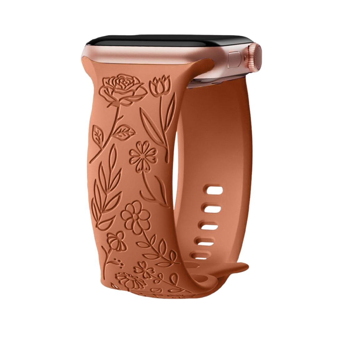 Designed to complement your Apple Watch effortlessly, the intricate floral engravings add a touch of sophistication to your wrist, making a statement without overpowering your style. The soft silicone material ensures a snug and comfortable fit, allowing you to wear your Apple Watch all day long without any discomfort. The band is also waterproof and sweat-resistant, making it perfect for workouts or outdoor activities.
